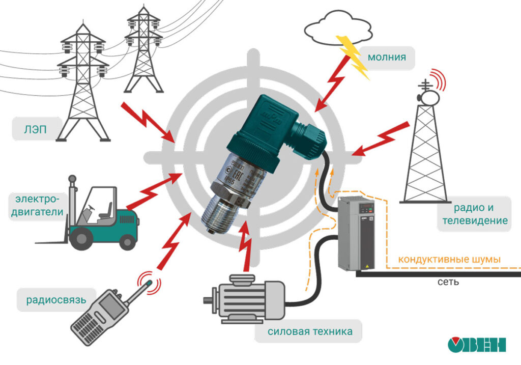 Преобразователи давления ОВЕН, особенно модели ПД100И, часто устанавливаются на промышленных объектах с высоким уровнем электромагнитных помех от оборудования, такого как электродвигатели, рации связи, линии электропередачи и другие источники. Важной характеристикой для работы в таких условиях является электромагнитная совместимость (ЭМС), то есть способность устройства работать при воздействии помех и не создавать их самостоятельно.