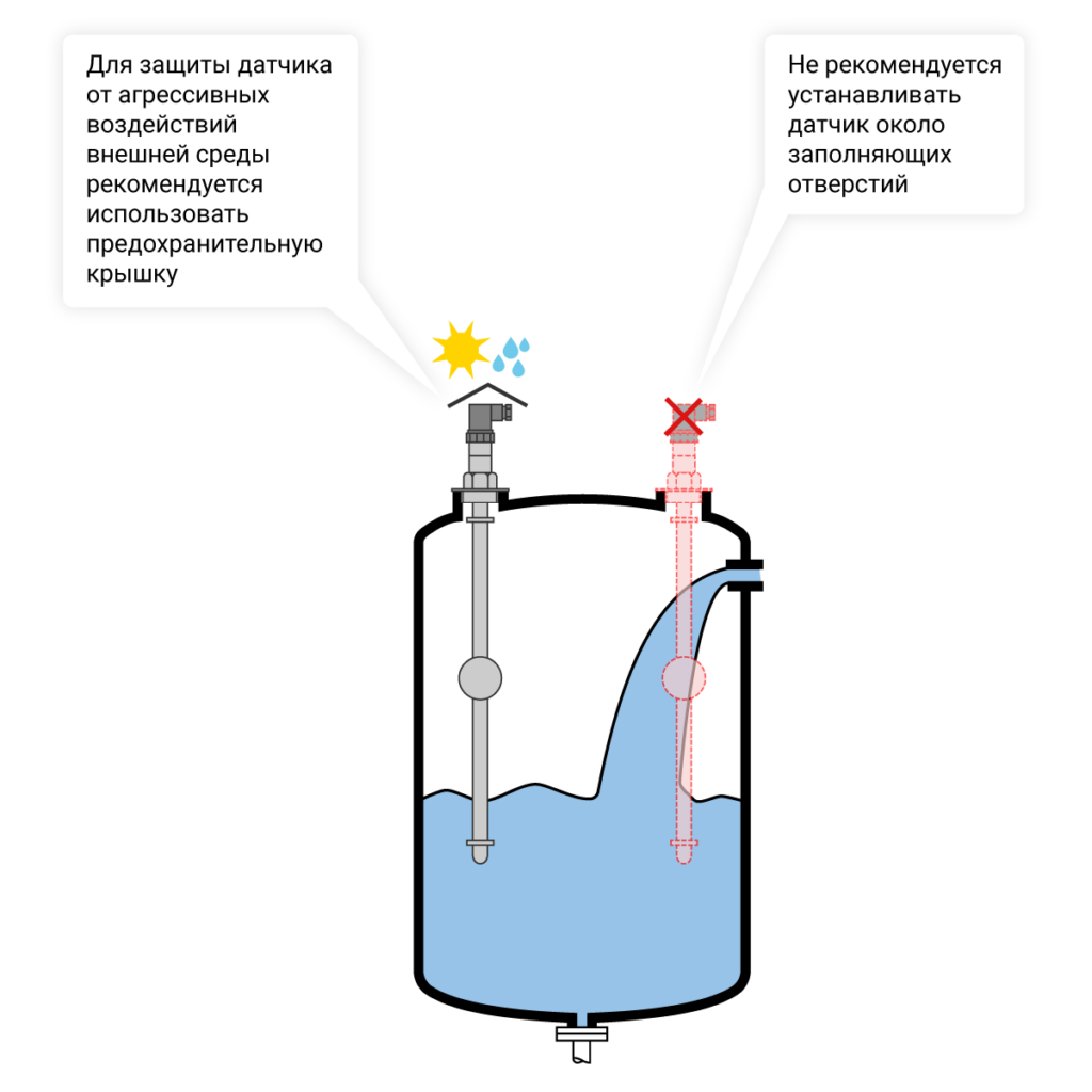 - Обеспечить дополнительное крепление в резервуаре снизу арматуры датчика, чтобы не ограничивать рабочее движение поплавка.