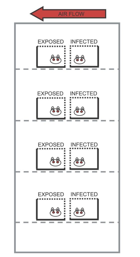 Ученые провели эксперимент, поместив 8 морских свинок в камеру с регулируемым микроклиматом. На одной полке находились зараженное и здоровое животное. Воздух свободно циркулировал в клетках, чтобы изучить влияние влажности на распространение вируса.