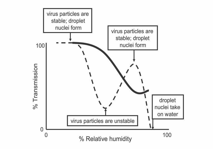 При повышении температуры воздуха в помещении относительная влажность уменьшается, делая воздух сухим. В сухом воздухе с относительной влажностью менее 40% вирусы легче размножаются. Сухость воздуха может привести к пересохшей слизистой носа, ухудшающей ее защитные функции. При кашле или чихании в сухом воздухе капли вирусов могут долго оставаться в воздухе, что способствует их распространению и заражению организма.