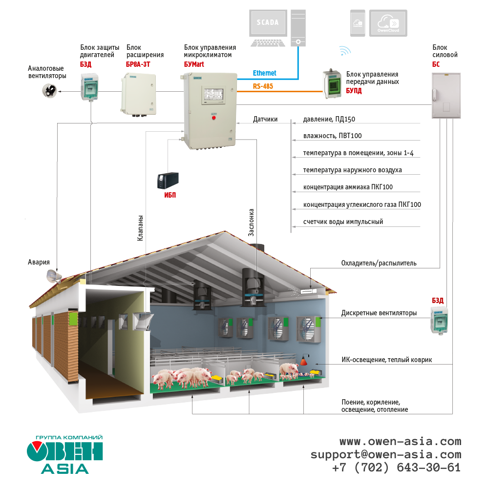 Компания ОВЕН разработала готовые решения для создания оптимальных условий выращивания животных в свиноводческих хозяйствах различного диапазона: от малых ферм до крупных животноводческих комплексов. Предлагаемые решения обеспечивают контроль и поддержание оптимального микроклимата посредством управления вентиляцией, обогревом, уровнем влажности, с учетом концентрации вредных газов: аммиака, сероводорода и углекислого газа. Системы увязывают работу оборудования отопления, вентиляции, увлажнения с первичными датчиками в единый контур с обратными связями. Кроме этого, системы могут управлять освещением, линиями кормораздачи и поения.