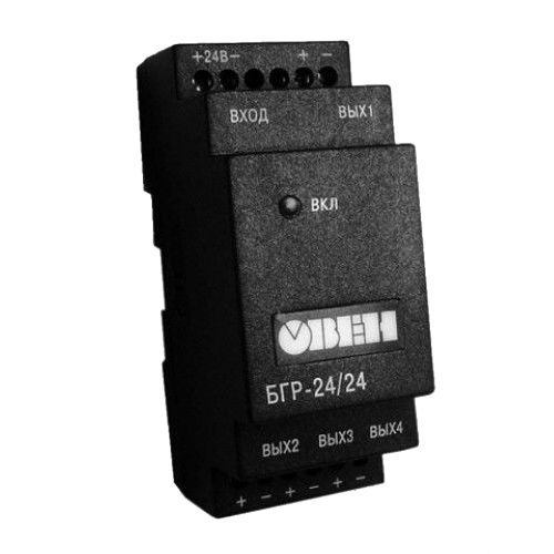 Блок гальванической развязки – БГР2(4)-24/24 – предназначен для питания оборудования нестабилизированным напряжением постоянного тока 24 В. БГР представлен в четырехканальном и двухканальном исполнениях и в зависимости от этого формирует 4 или 2 изолированных друг от друга выходных напряжения 24 В с нагрузочной способностью выходов не более 40 мА.