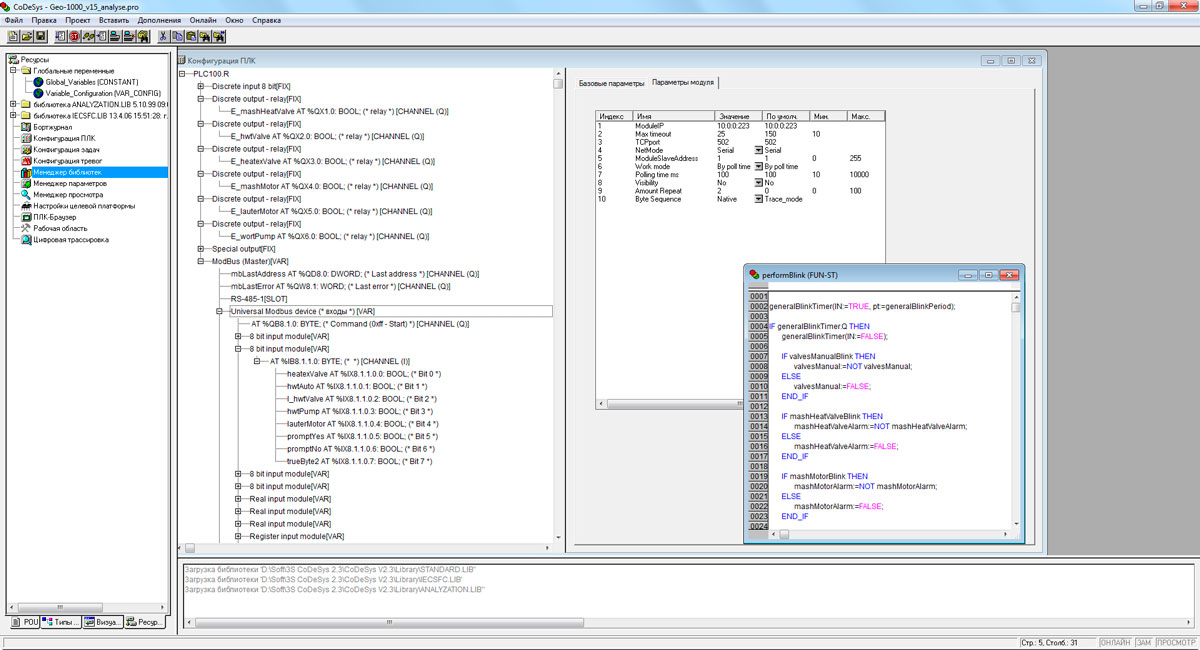 Также в состав СoDeSys входит редактор визуализации, конфигураторы протоколов обмена и средства отладки.