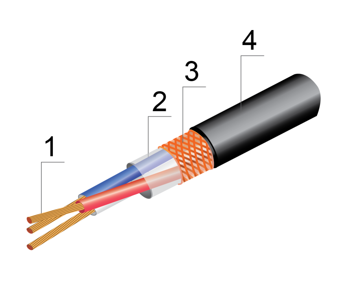 1 – токопроводящие жилы (медная луженая проволока) 2 – изоляция (ПВХ пластикат) 3 – экран (медная проволока) 4 – оболочка (ПВХ пластикат) |