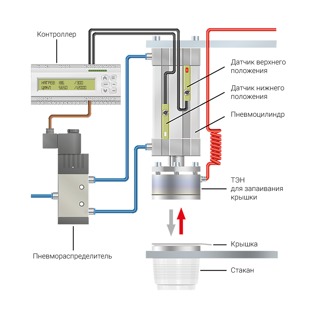 - Контроллер подаёт команду «вниз» на пневмораспределитель.