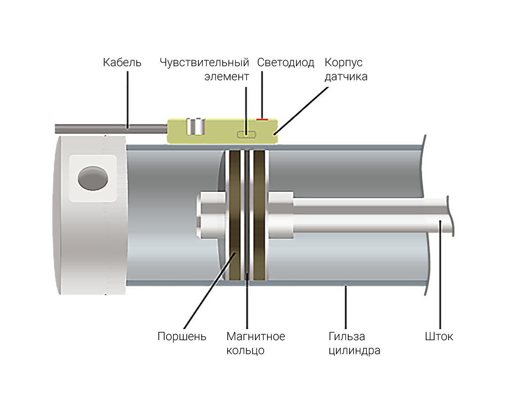 Принцип работы герконовых и магниторезистивных датчиков одинаков. На поршне цилиндра установлено магнитное кольцо. В момент приближения поршня с магнитным кольцом к датчику чувствительный элемент реагирует на магнитное поле, и выход датчика замыкается. Одновременно с замыканием выхода включается светодиод, сигнализируя о срабатывании датчика.