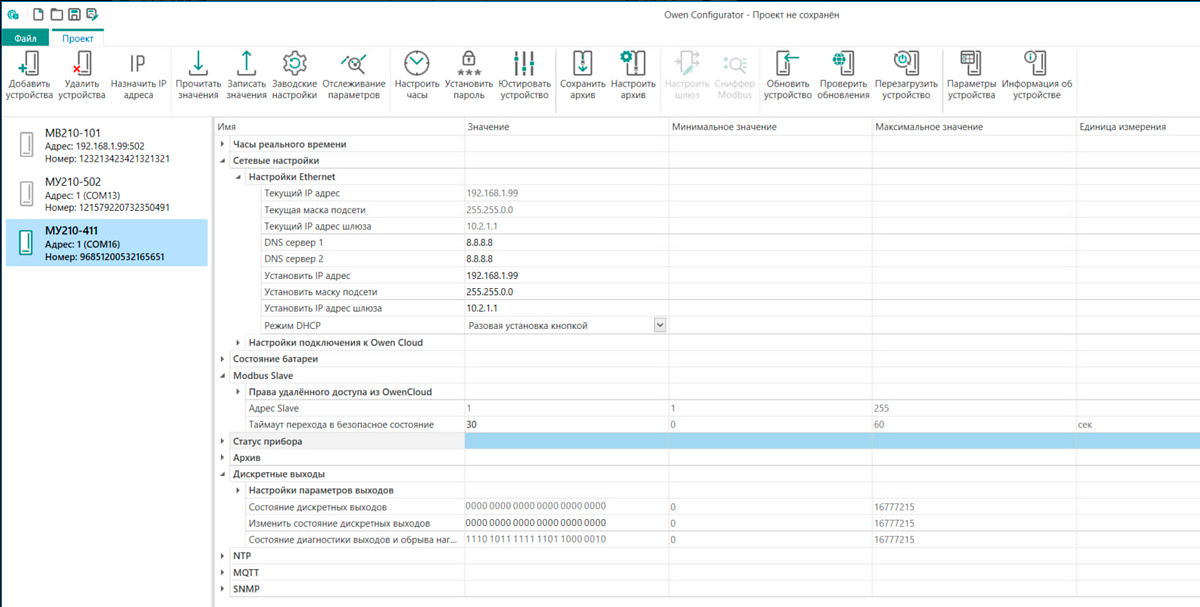 Настройка модулей Мx210 осуществляется с помощью конфигуратора, который поддерживает работу с группой модулей и позволяет оперативно получить доступ ко всем параметрам. Подключение осуществляется по интерфейсам Ethernet или USB (разъем типа microUSB). При подключении по USB внешнее питание модуля не требуется.