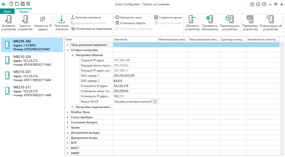 Настройка модулей Мx210 осуществляется с помощью конфигуратора, который поддерживает работу с группой модулей и позволяет оперативно получить доступ ко всем параметрам. Подключение осуществляется по интерфейсам Ethernet или USB (разъем типа microUSB). При подключении по USB внешнее питание модуля не требуется.