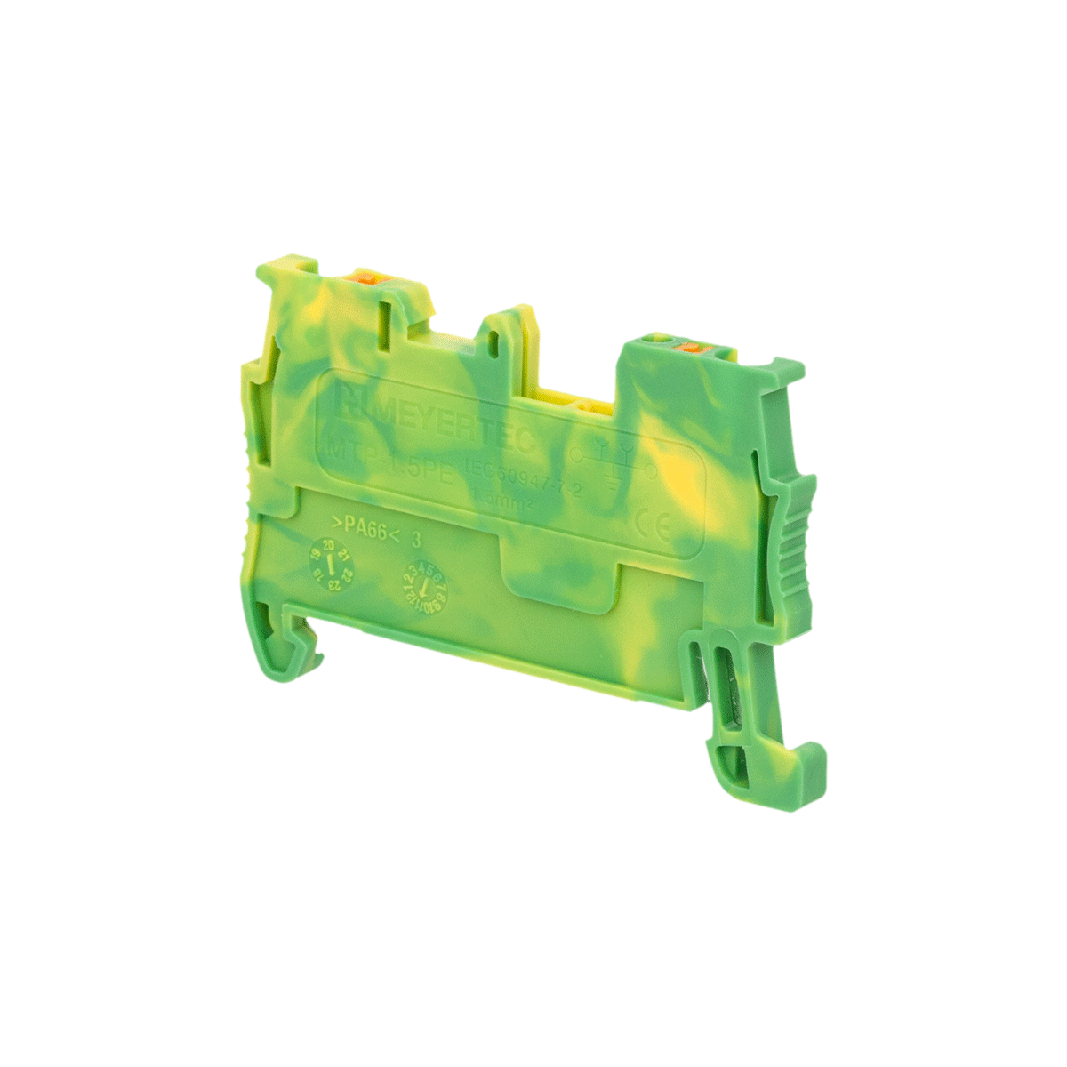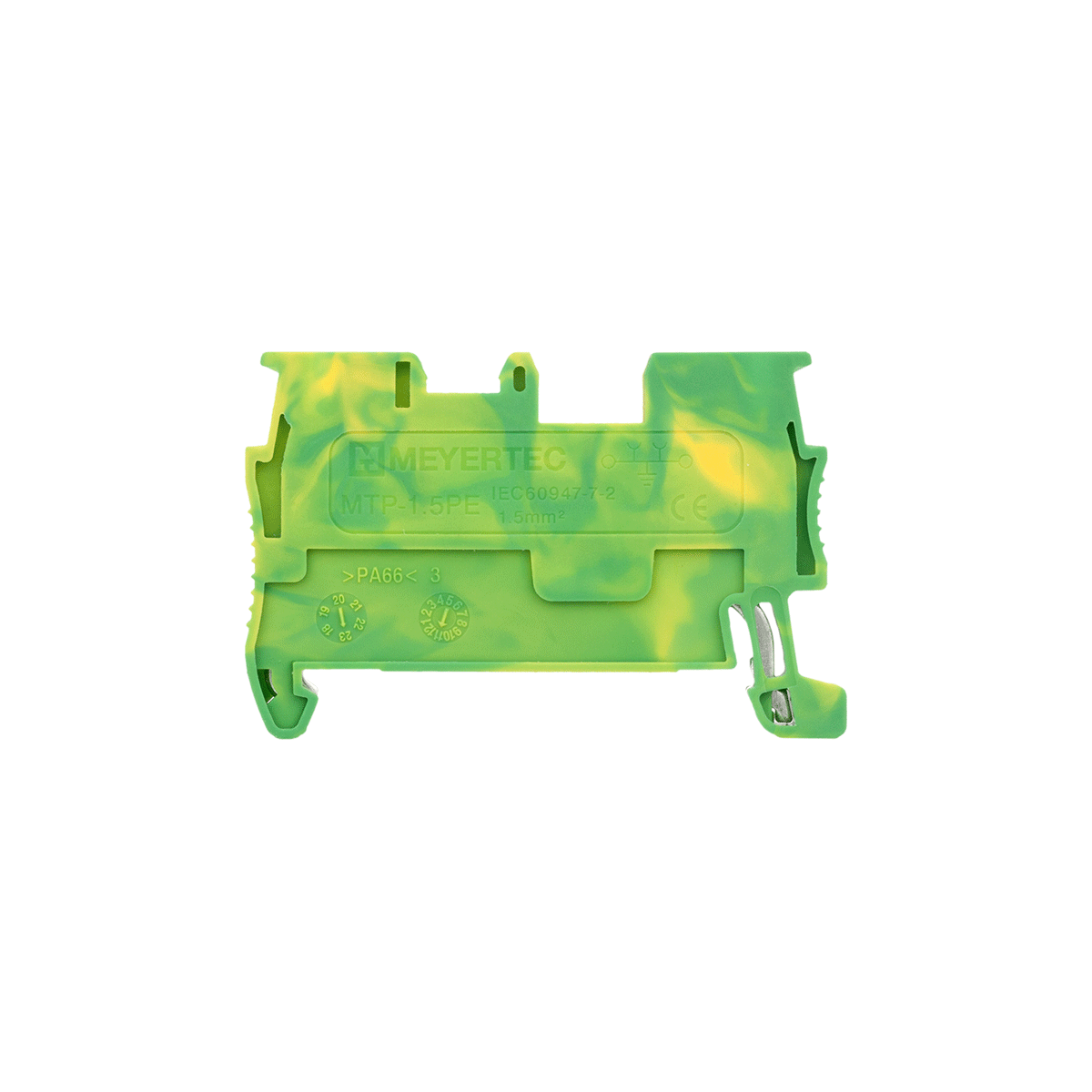 Клеммы push-in «Земля» MTP-1.5PE применяются для подключения защитных заземляющих проводников. Клемма фиксируется на DIN-рейке простым защелкиванием без использования инструментов.