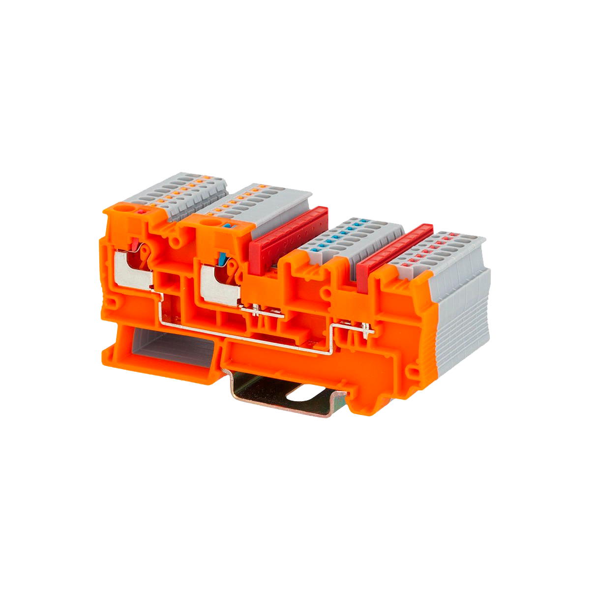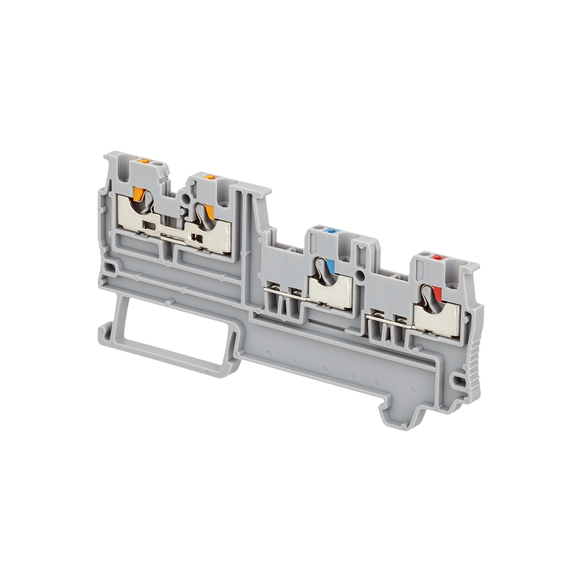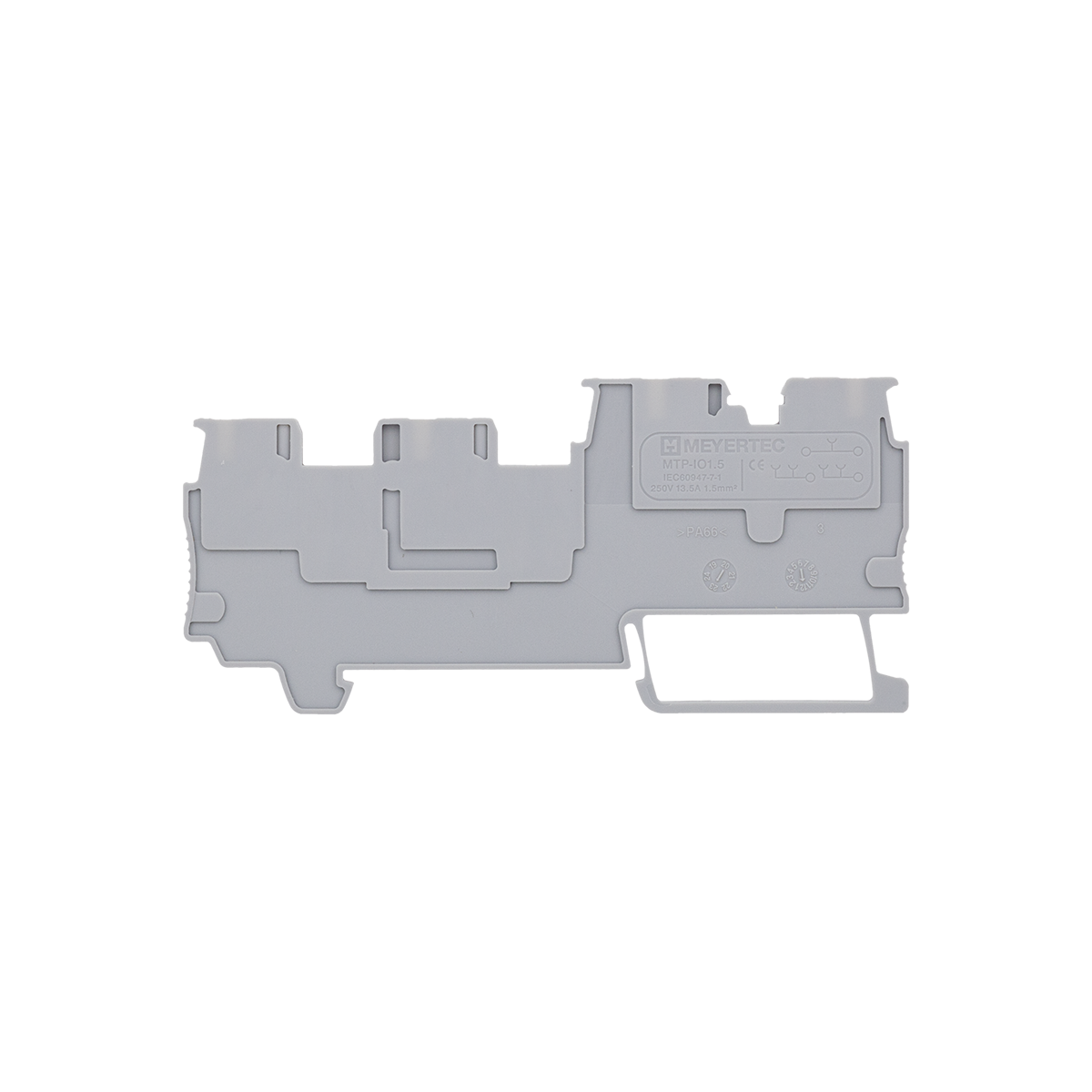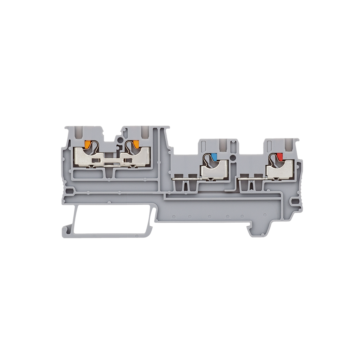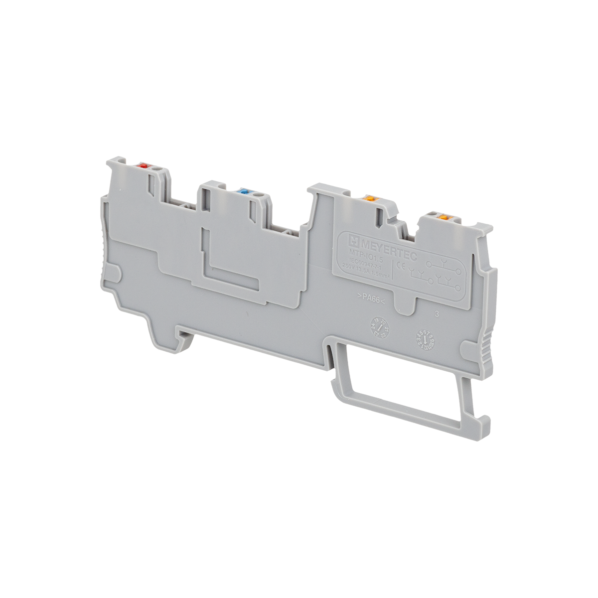Клеммы MTP-IO1.5 с зажимами push-in предназначены для подключения датчиков и исполнительных устройств по трехпроводной схеме. Клемма имеет два изолированных разъема для подключения питающих проводников сечением 1,5 мм² и два проходных разъема для подключения сигнальных проводников сечением 1,5 мм².