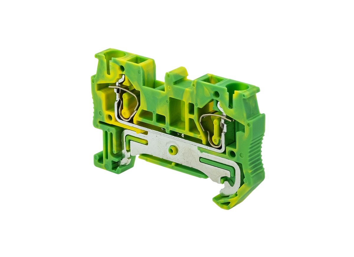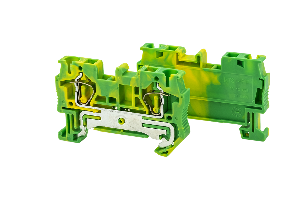 Заземляющие пружинные клеммы MTS-2.5PE применяются для подключения защитных заземляющих проводников сечением 2,5мм2. Клемма фиксируется на DIN-рейке простым защелкиванием без использования инструментов.
