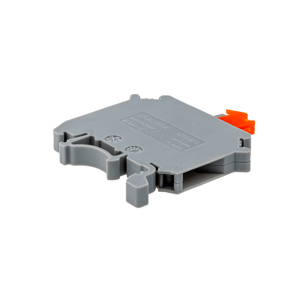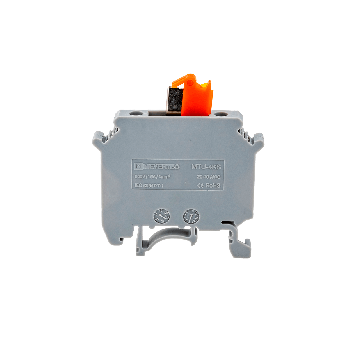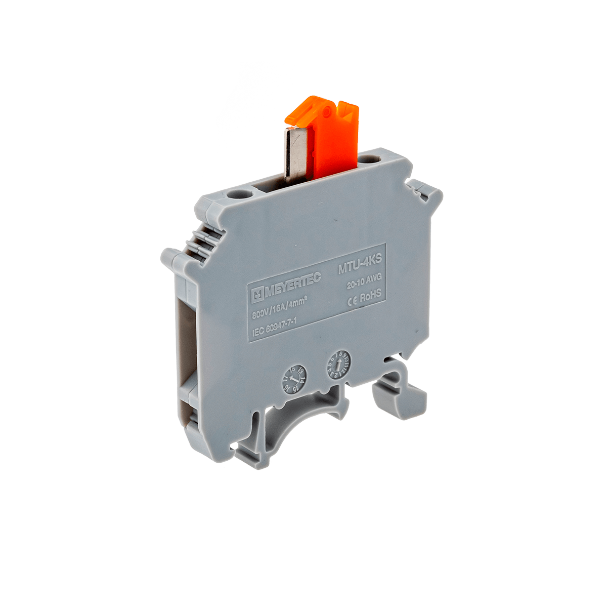 Клеммы MTU-4KS с ножевым размыкателем применяются в цепях для оперативного и безопасного отключения нагрузки во время отладки или измерений. Не требуется отключение проводников, достаточно поднять рычаг размыкателя. Токоведущая часть клемм закрыта с двух сторон, применение заглушек не требуется.