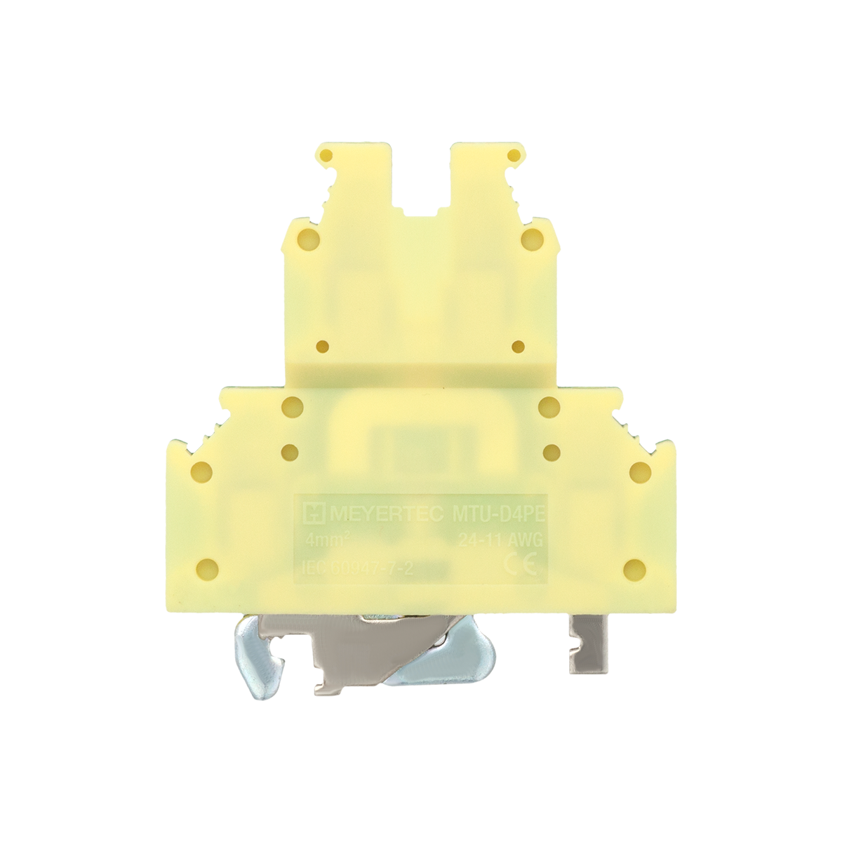 Заземляющие двухуровневые клеммы MTU-D4PE обеспечивают заземление проводников благодаря контакту токоведущей шины с DIN-рейкой (при условии заземления монтажной пластины шкафа). Конструкция клемм не требует применения торцевых заглушек. Заземляющие клеммы надежно устанавливаются на DIN-рейке с помощью винтового механизма.