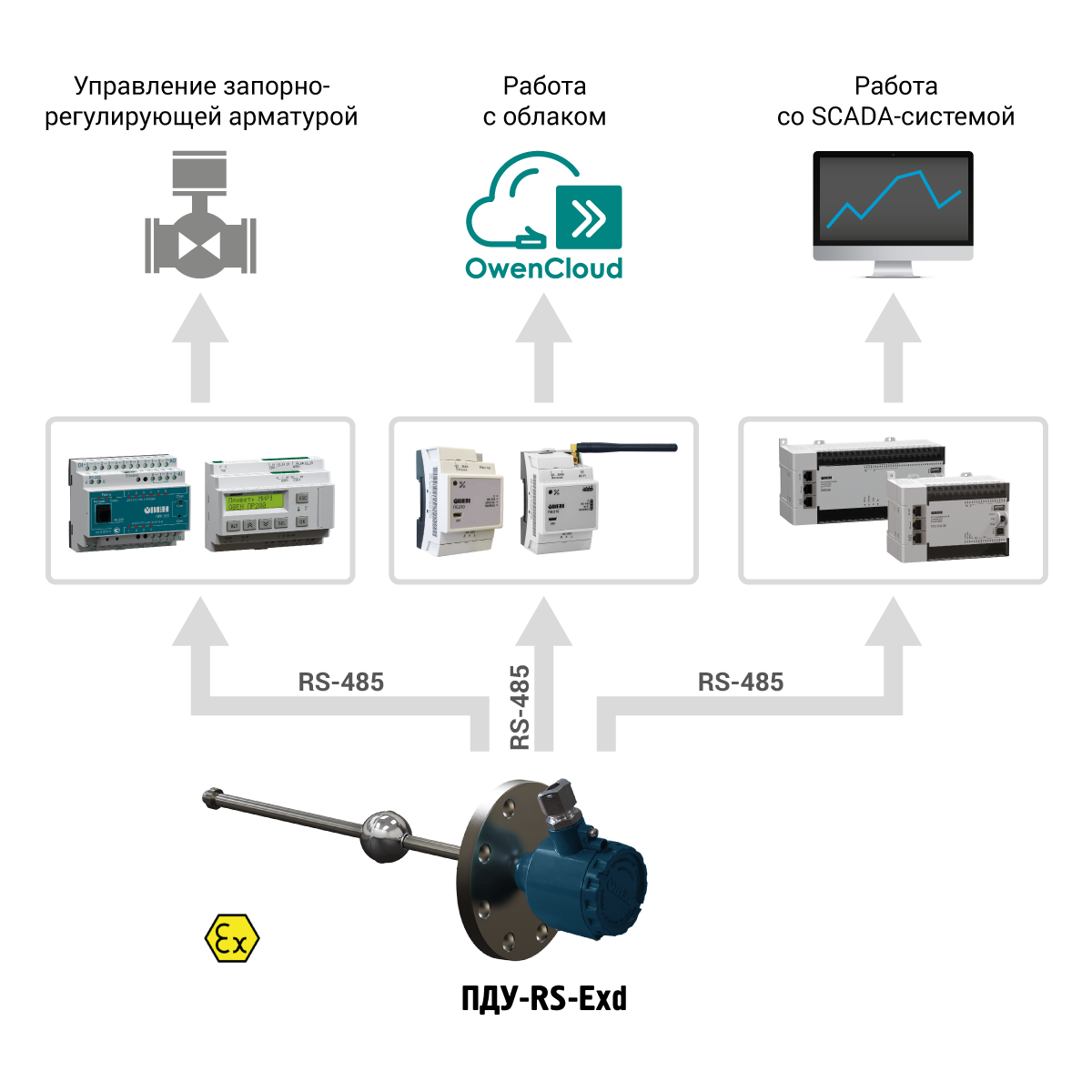 Протокол Modbus RTU позволяет передавать данные по сети RS-485 и подключать его напрямую к контроллерам, облачным сервисам и другим системам управления. Использование поплавковых датчиков ПДУ-RS-Exd значительно упрощает и удешевляет пуско-наладочные работы ввиду освобождения части аналоговых входов применяемых в системе контроллеров и модулей.
