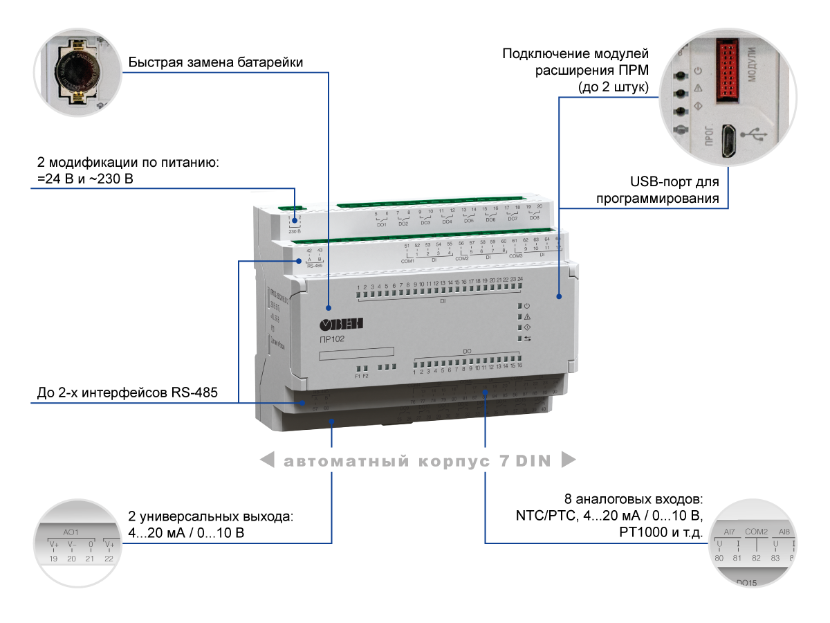 В корпусе 7DIN располагается 40 аналоговых и дискретных входов/выходов. Для расширения собственных входов/выходов предусмотрено подключение по внутренней шине модулей расширения ПРМ. В ПР102 может быть до 2-х интерфейсов RS-485 на борту: для управления устройствами по сети и передачи данных на верхний уровень. Написание алгоритма осуществляется пользователем на языке FBD с помощью бесплатной среды программирования Owen Logic. Загрузка алгоритма производится с помощью кабеля microUSB.