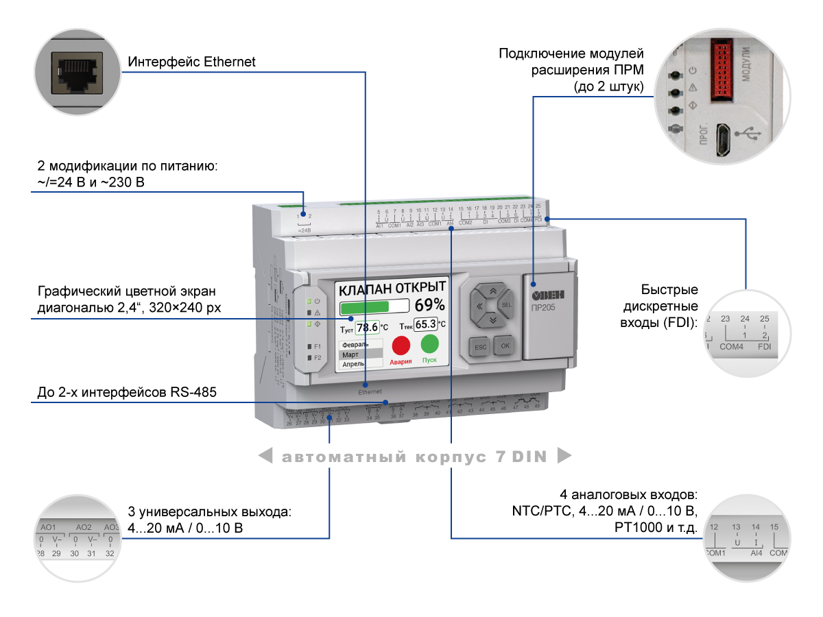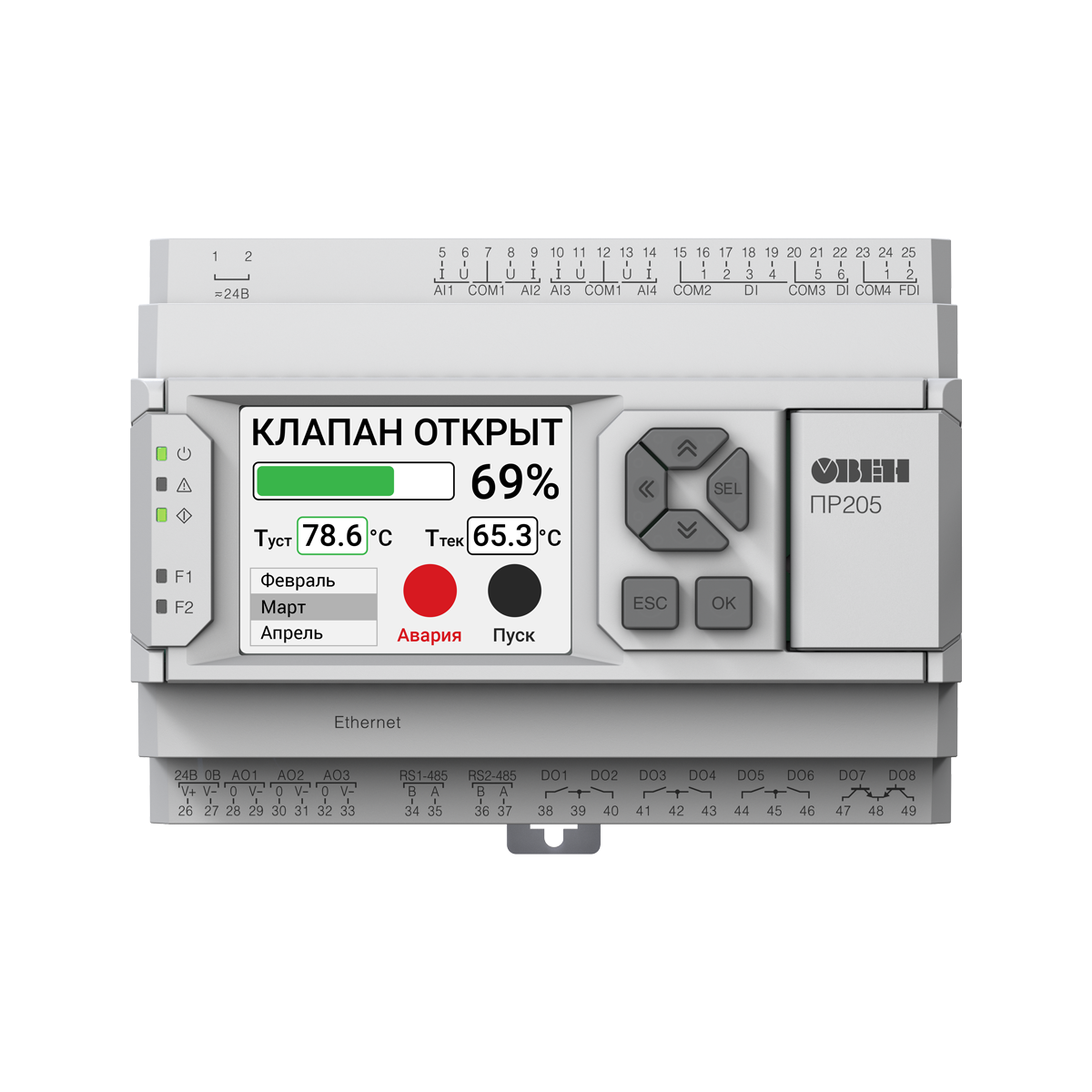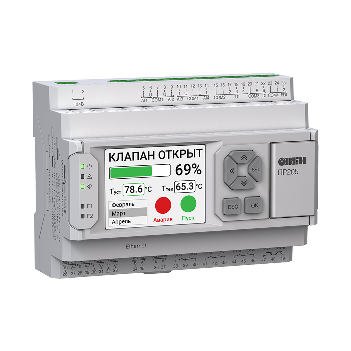 ПР205 – новое программируемое реле с графическим дисплеем и Ethernet. Прибор сочетает в себе оптимальную конфигурацию аналоговых и дискретных входов/выходов для управления системами вентиляции, отопления, кондиционирования и др. При необходимости количество входов/выходов можно увеличить с помощью модулей расширения ПРМ.