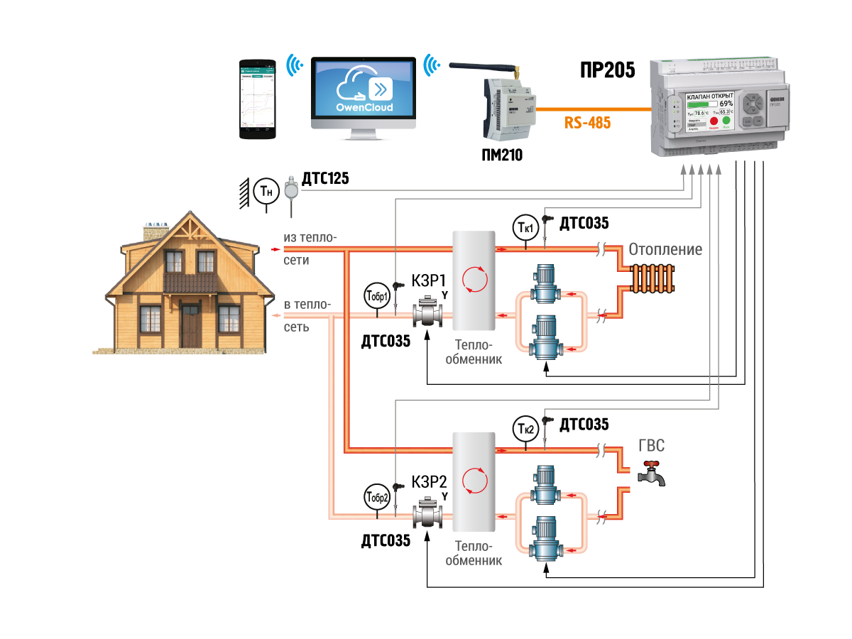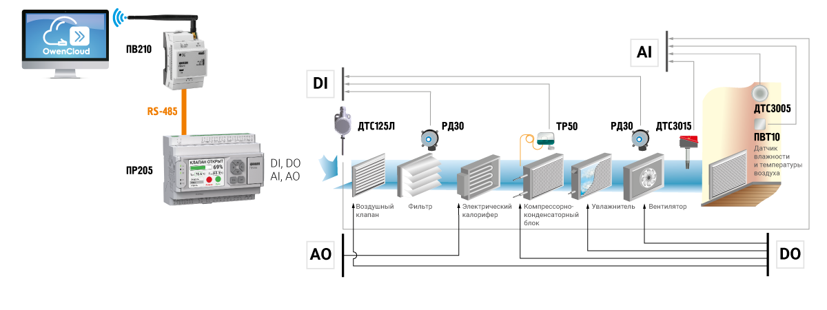 Интерфейс Ethernet позволяет интегрировать прибор в распределенные системы, увеличивать количество входов/выходов с помощью модулей ввода/вывода Мх210, реализовывать удаленный контроль и управление оборудованием с помощью облачного сервиса OwenCloud. В ПР205 предусмотрены модификации с 2-мя интерфейсами RS-485 на борту для передачи данных на верхний уровень и управления другими элементами системы.