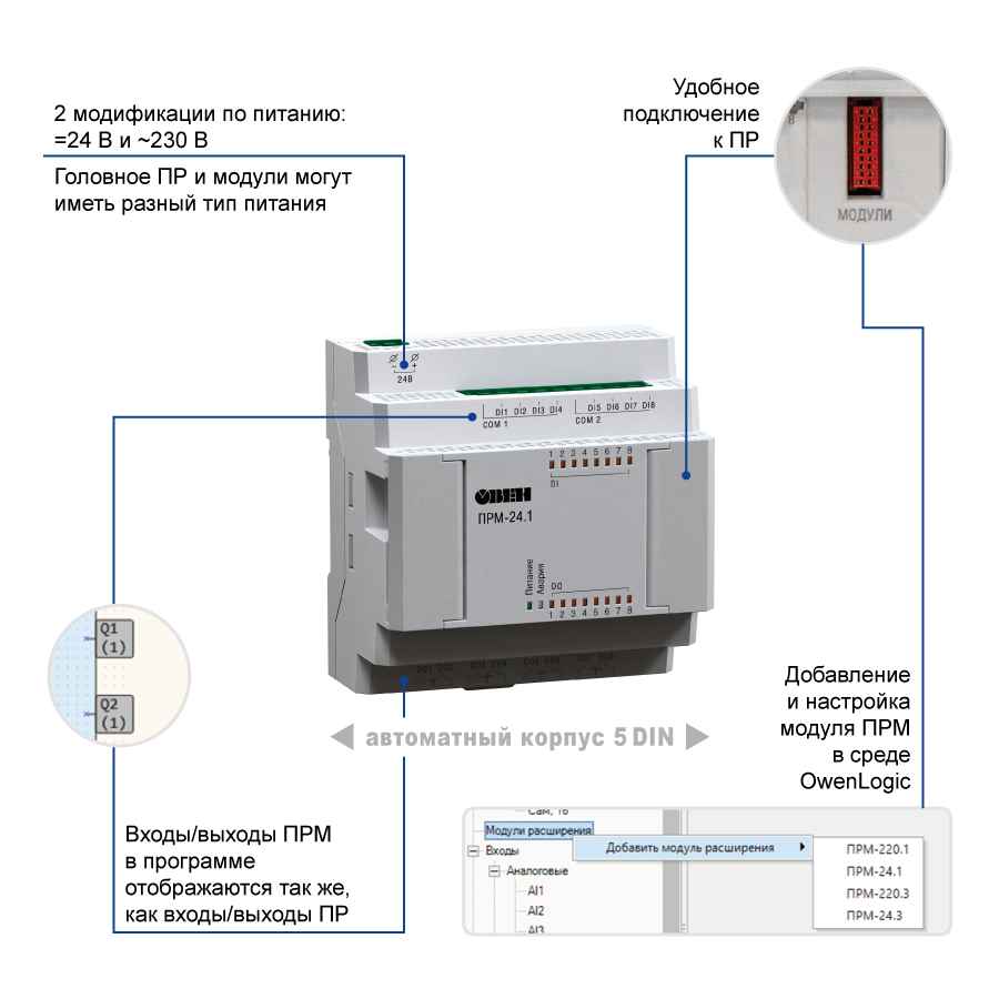 - ПРМ-1 – для увеличения дискретных входов и выходов;