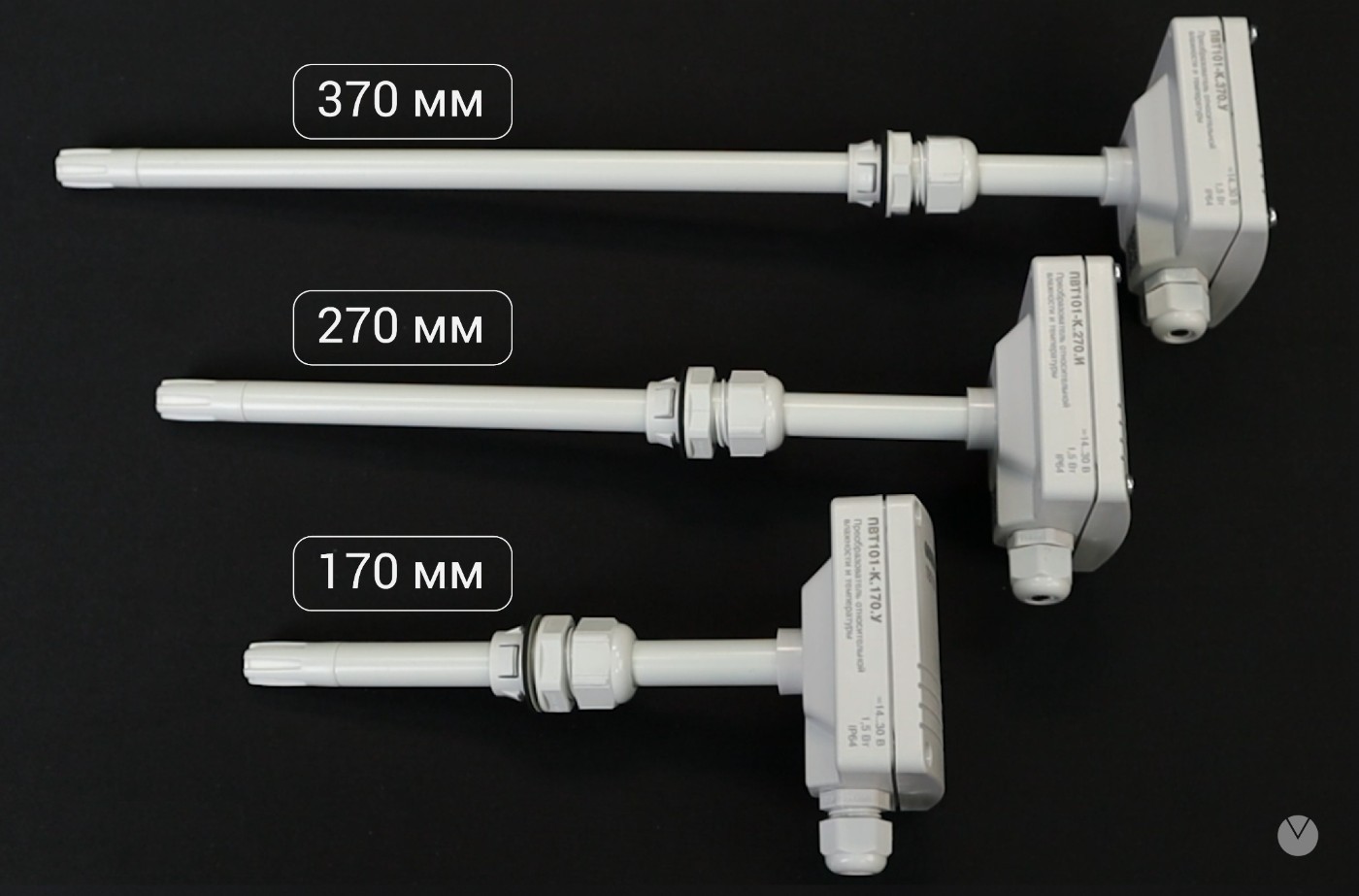 У новой модели есть возможность выбрать длину зонда при заказе: 170, 270, 370 мм, в зависимости от диаметра воздуховода, в который датчик устанавливается.